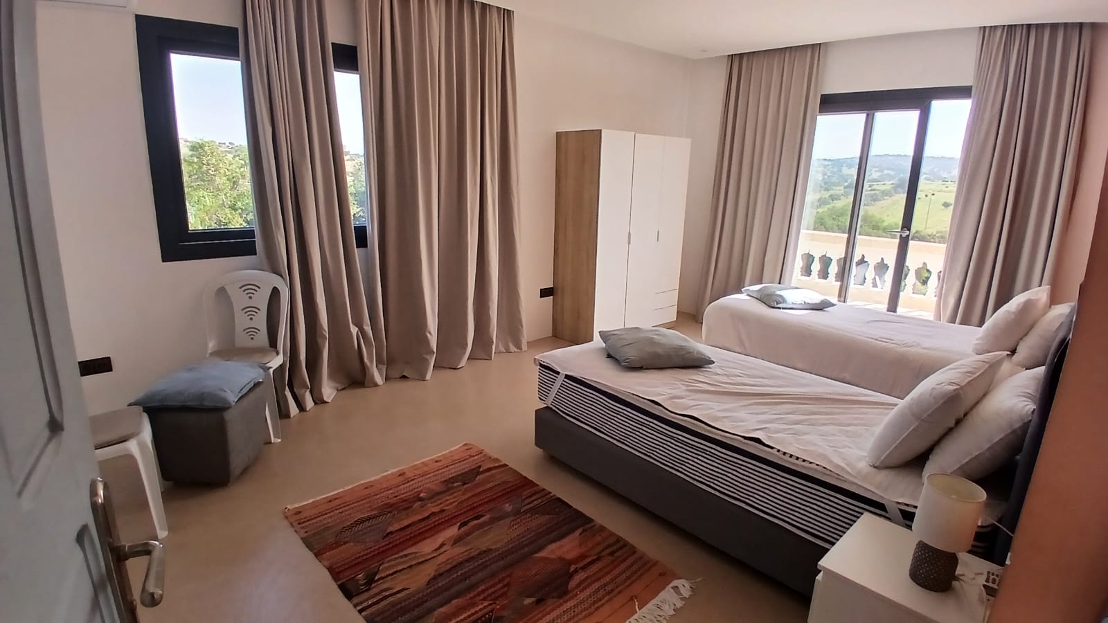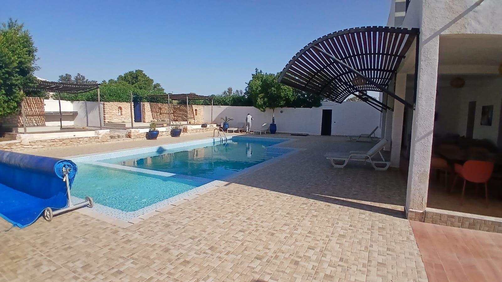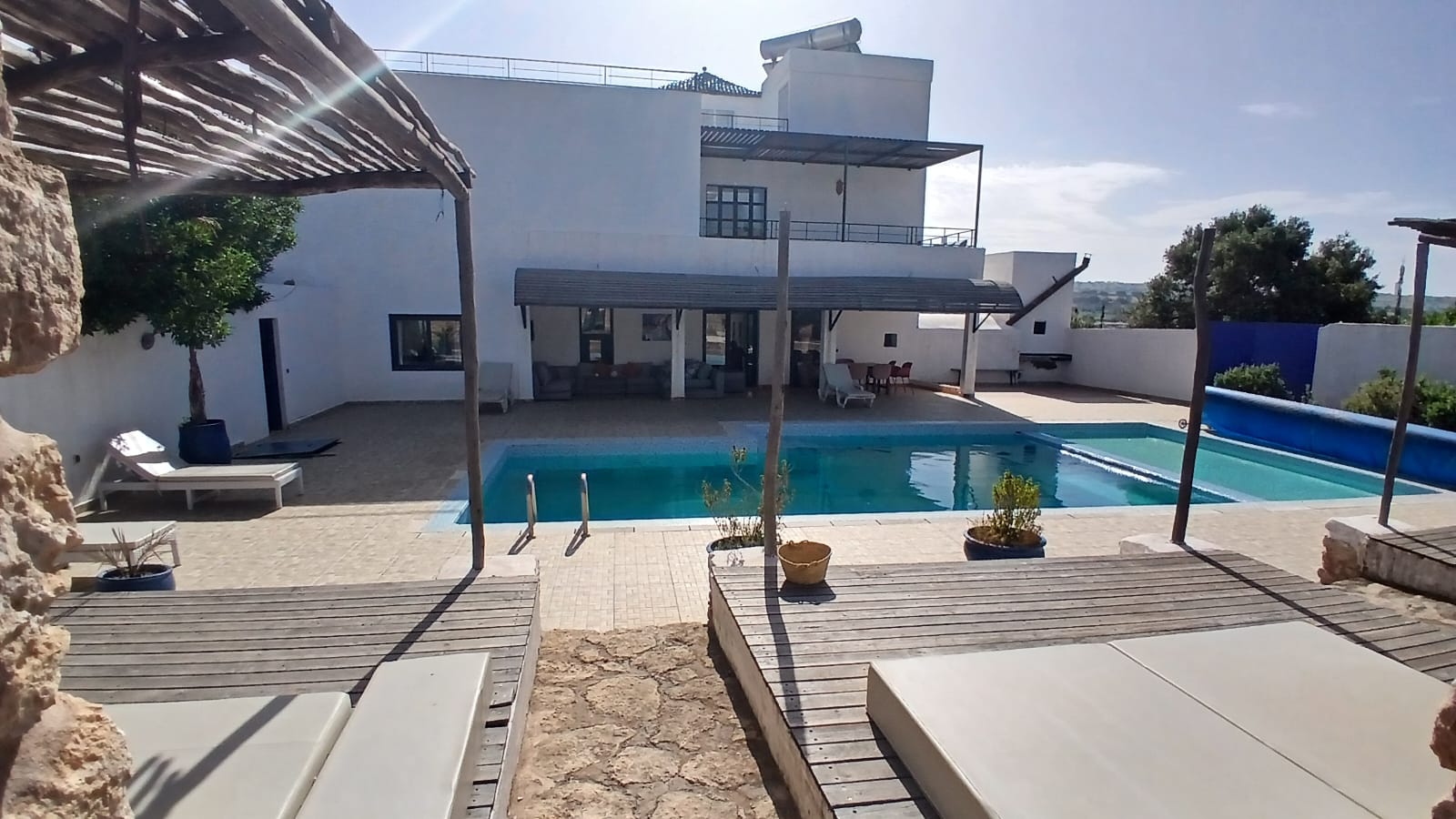 Belle villa moderne de 350 m² sur 1.2 ha avec vue dominante, maison de gardien, portail à télécommande, piscine, dépendances, buanderie, tente caïdale équipée en salle de jeu et de détente, terrasses, barbecue, roof top avec bar, hammam traditionnel.