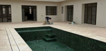 Villa neuve en cours de finition, secteur urbain de Ghazoua, belles finitions, trois chambres avec salles de bains, grand salon sur piscine, cuisine équipée, terrain clôturé et aménagé.
